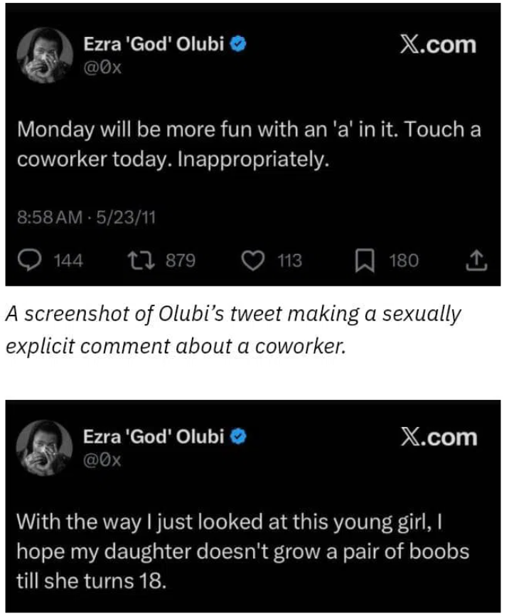 The incident has triggered renewed scrutiny of Olubi’s past social media activity. Several tweets he posted between 2009 and 2013, containing sexually explicit remarks about co-workers, minors, and sexualised cartoon characters, resurfaced and went viral. One controversial post from 2011 stated: