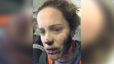 Pictures show the woman, who was not named, with a blackened face and neck and blisters on her hands, with passengers having to endure the smell of melted plastic, burnt electronics and burnt hair for the remainder of the flight.