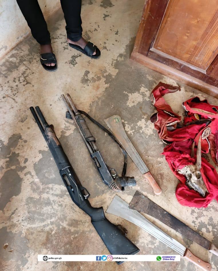 Items recovered from the scene included two pump-action guns, three machetes, four motorbikes, a tricycle, and various regalia.