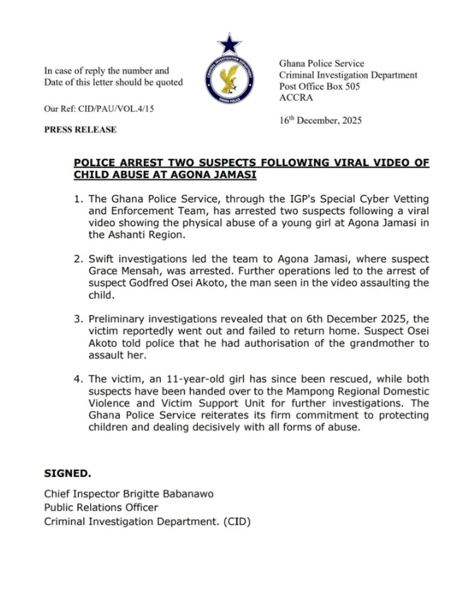 The Ghana Police Service has arrested two suspects in connection with a viral video showing the physical abuse of an 11-year-old girl at Agona Jamasi in the Ashanti Region.