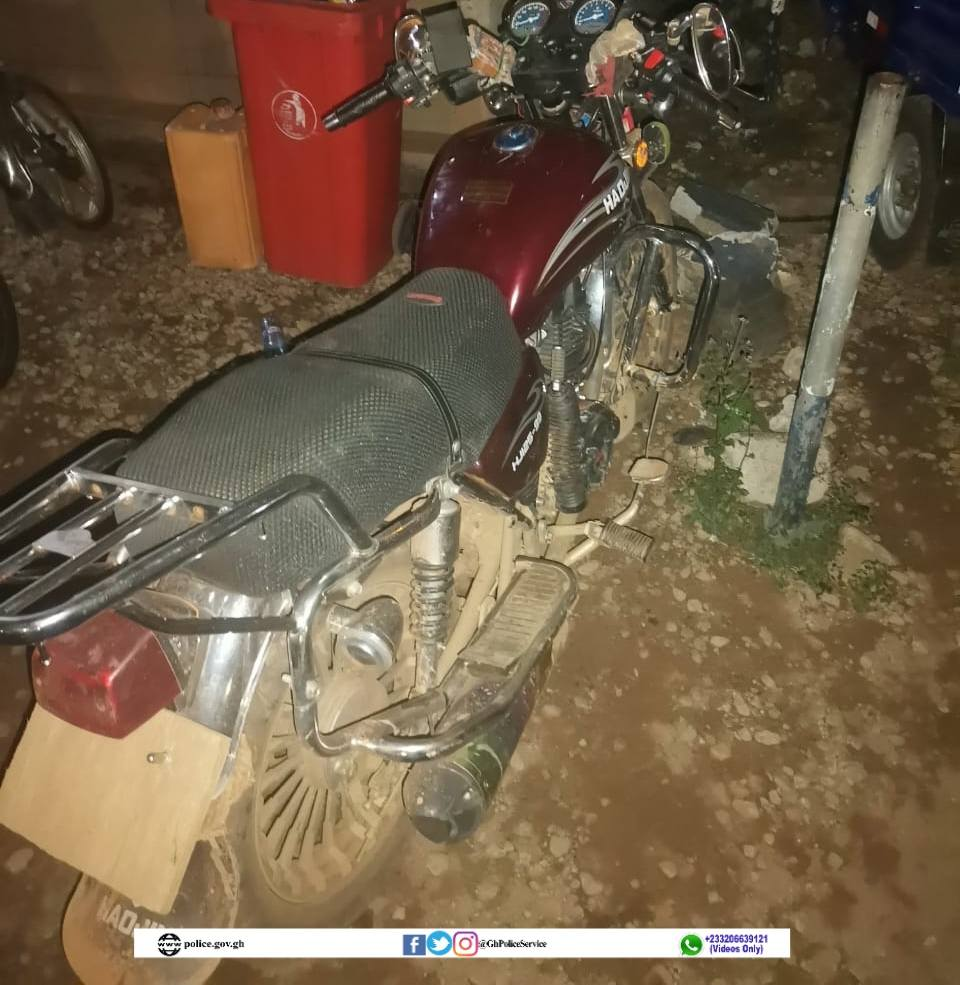 In the ensuing pursuit, one suspect—identified as Pascal Yenkye—was apprehended after he attempted to flee on one of the motorbikes. He sustained a gunshot wound to the leg during the operation and is currently receiving treatment under police guard.
