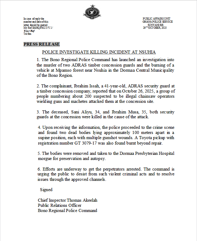 According to a statement signed by Chief Inspector Thomas Akeelah, Public Relations Officer of the Bono Regional Police Command, the attack occurred on October 26, 2025, when about 200 suspected illegal chainsaw operators armed with guns and machetes invaded the concession site.