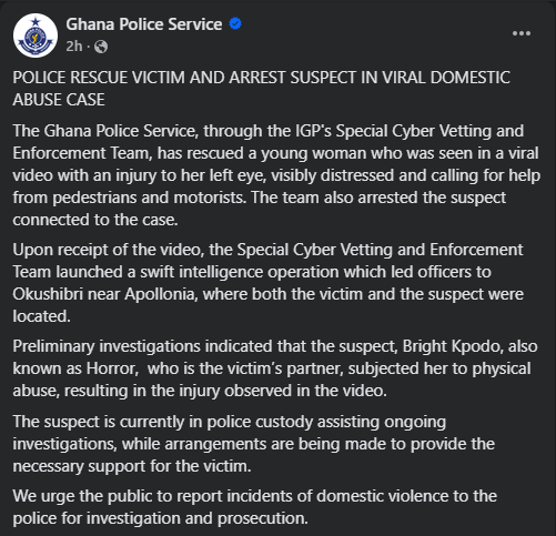 The Ghana Police Service has successfully rescued a young woman who appeared in a disturbing viral video showing her with a badly injured eye as she cried out for help.