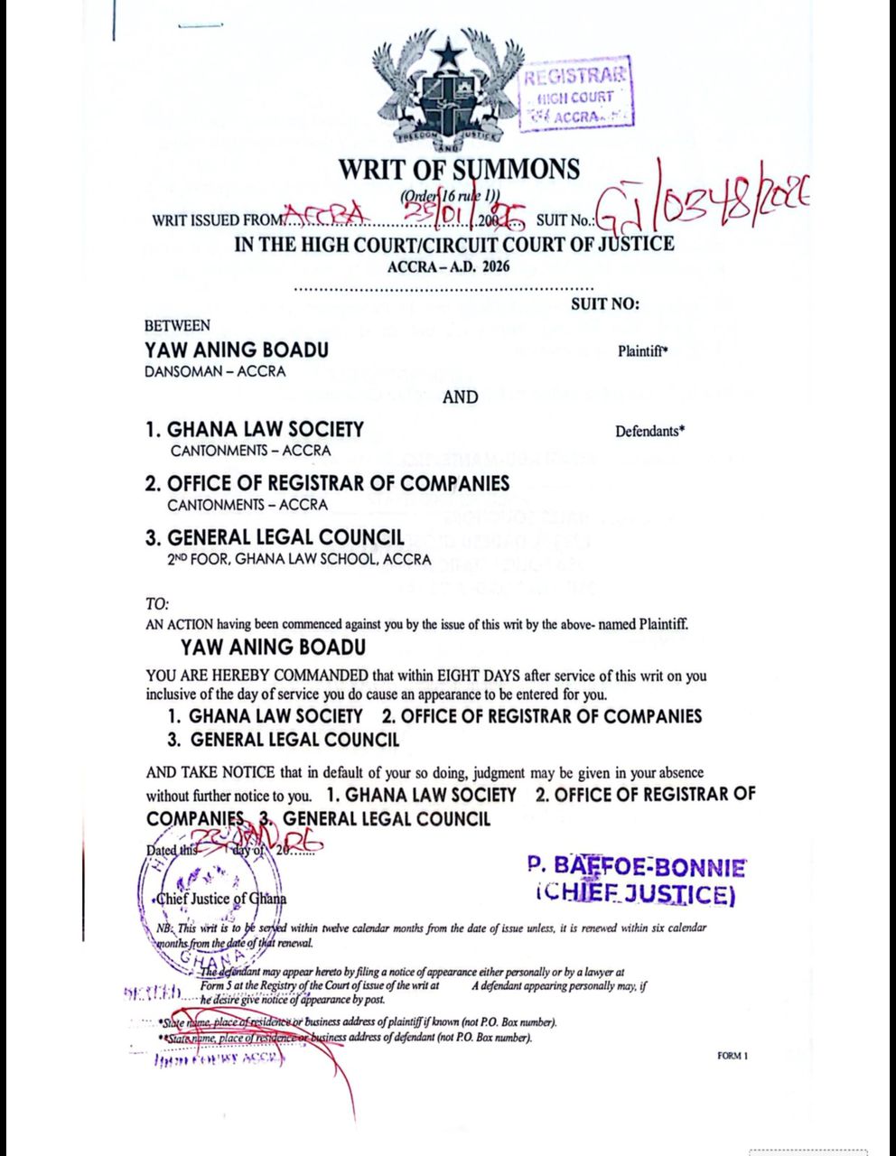 The suit names the Ghana Law Society, the Office of the Registrar of Companies (ORC), and the General Legal Council as defendants.