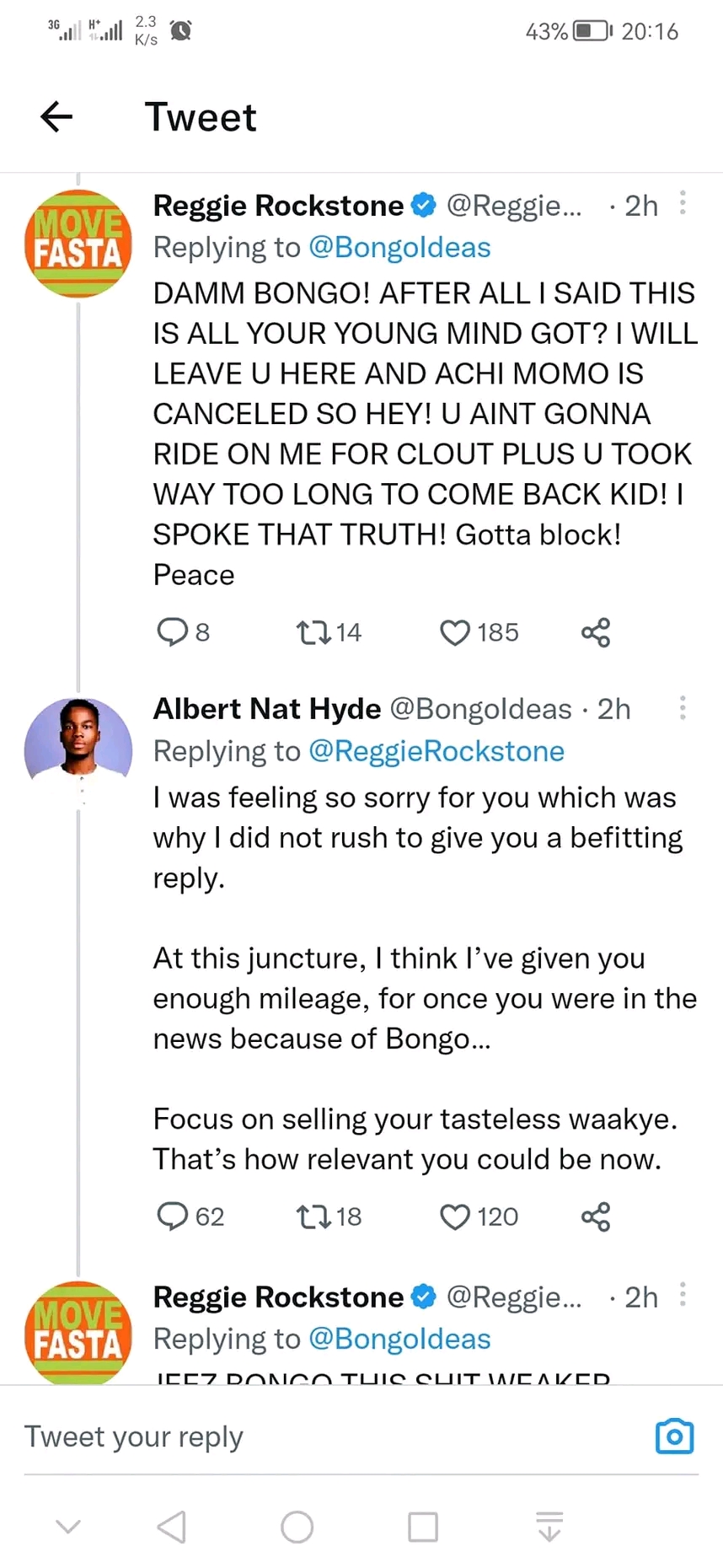 Then Bongo Ideas came forth once more, claiming that since Reggie was no more relevant, he was the one who was putting in the headlines. Bongo continues by saying the current Waakye vendor should concentrate on hawking his "tasteless" fare.