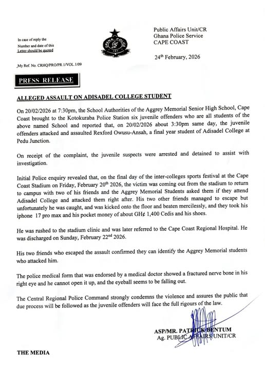 In a statement issued on Tuesday, February 24, 2026, the Central Regional Police Command said the incident took place on Friday, February 20, at about 3:30 p.m., shortly after the close of an inter-colleges sports festival at the Cape Coast Stadium.