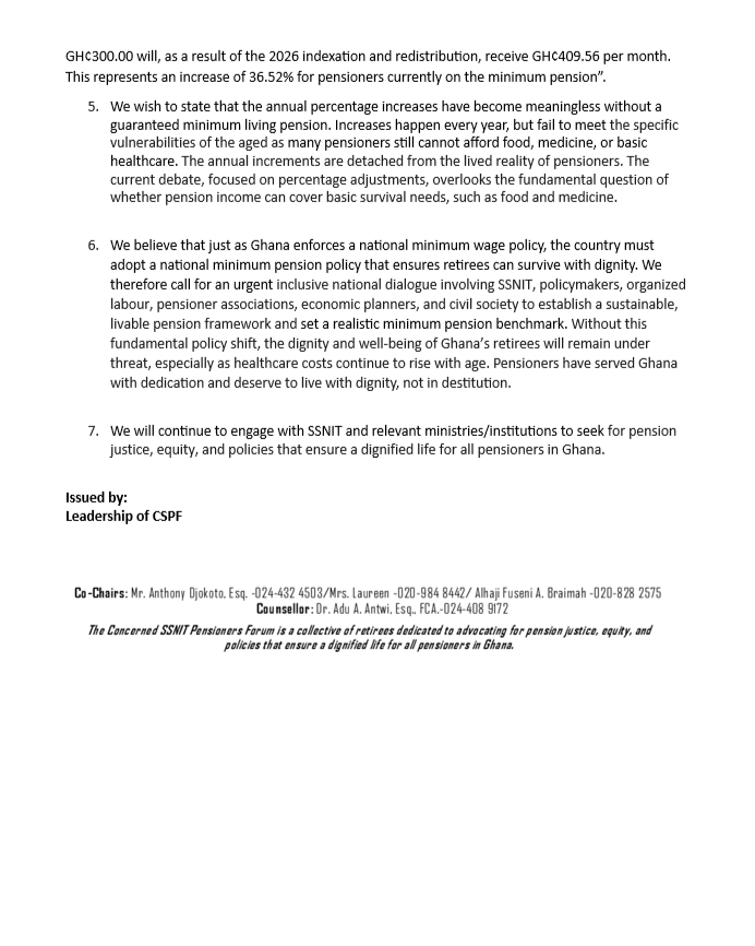 The Concerned SSNIT Pensioners Forum (CSPF) has rejected the 10 per cent pension increase announced by the Social Security and National Insurance Trust (SSNIT) for 2026, describing it as inadequate and insufficient to address the deteriorating living conditions of retirees, particularly those on low incomes.