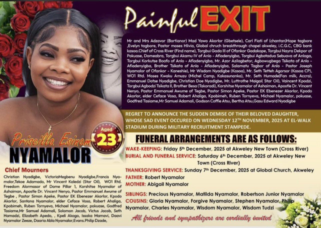 Ghana is once again gripped with sorrow as Priscilla Nyamalor, one of the six victims who died in the tragic military recruitment stampede at the El-Wak Sports Stadium, is laid to rest today.