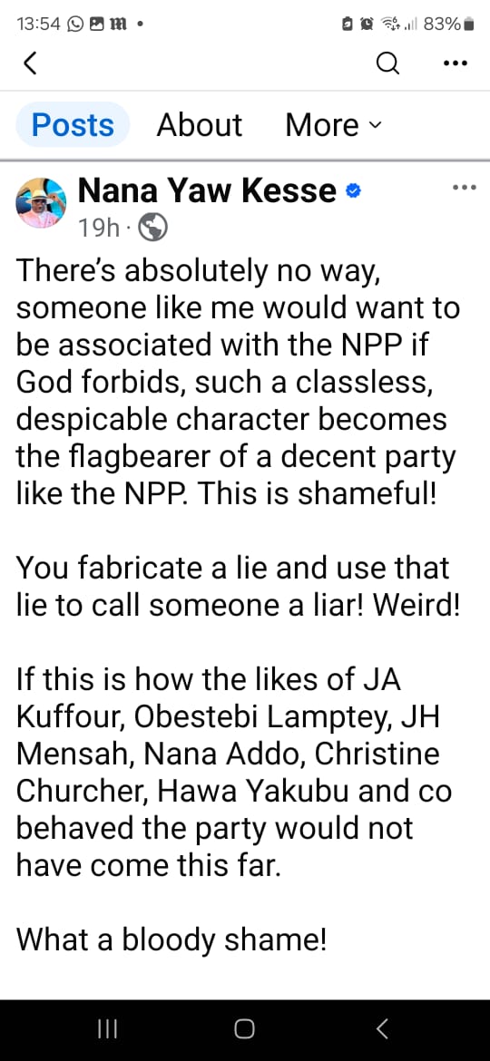 " There’s absolutely no way, someone like me would want to be associated with the NPP if God forbids, such a classless, despicable character becomes the flagbearer of a decent party like the NPP. This is shameful! You fabricate a lie and use that lie to call someone a liar! Weird," Nana Yaw Kesse, adding that," if this is how the likes of JA Kuffour, Obestebi Lamptey, JH Mensah, Nana Addo, Christine Churcher, Hawa Yakubu and co behaved the party would not have come this far. What a bloody shame!"