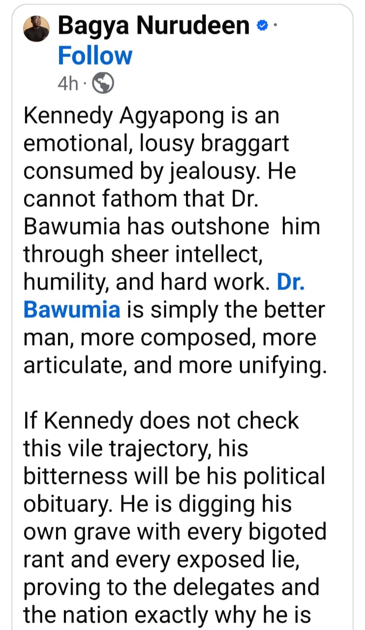 What he has directed at Dr. Bawumia is not competitive politics. It is opposition-style psychological warfare. These are not policy critiques; they are emotional grenades - designed to destabilise, not persuade," wrote another J. A. Sarbah.