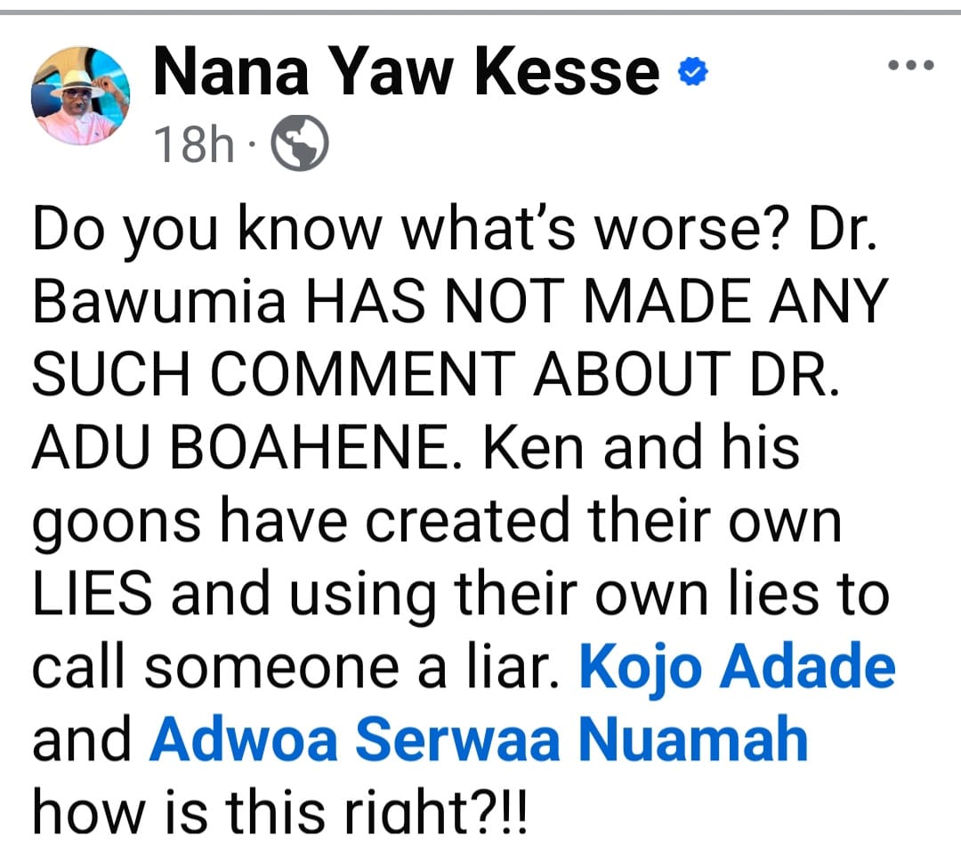 "Do you know what’s worse? Dr. Bawumia HAS NOT MADE ANY SUCH COMMENT ABOUT DR. ADU BOAHENE. Ken and his goons have created their own LIES and using their own lies to call someone a liar," Nana Yaw Kesse wrote again.