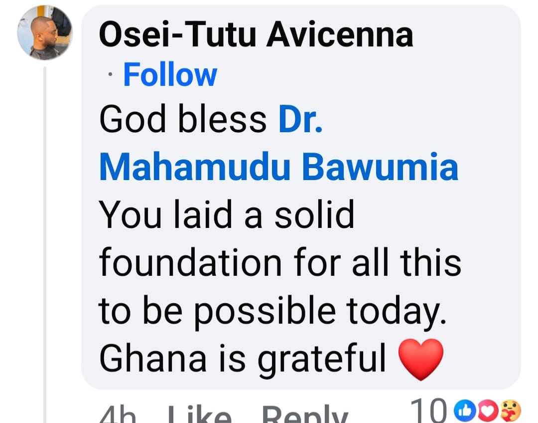 Another commentator, Osei-Tutu Avicenna, on his part, said "God bless Dr. Mahamudu Bawumia. You laid a solid foundation for all this to be possible today. Ghana is grateful."