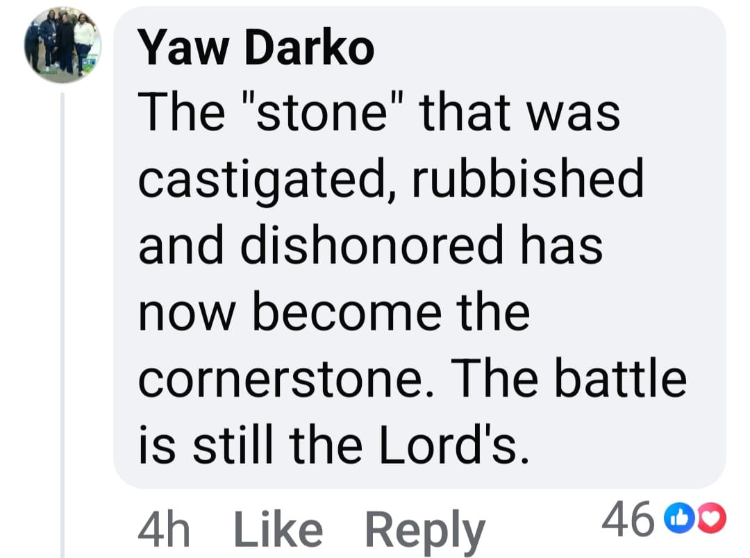 "The stone that was castigated, rubbished and dishonoured has now become the cornerstone. The battle is still the Lord's," Yaw Darko, commented under the post.