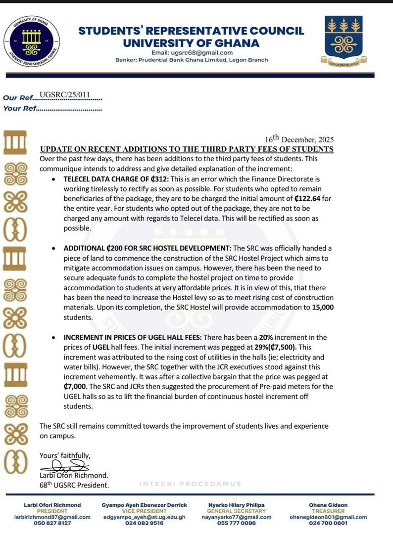 The Students’ Representative Council (SRC) of the University of Ghana has stepped forward to address growing concerns among students over recent changes to third-party charges on their fee bills, offering explanations, corrections, and assurances.