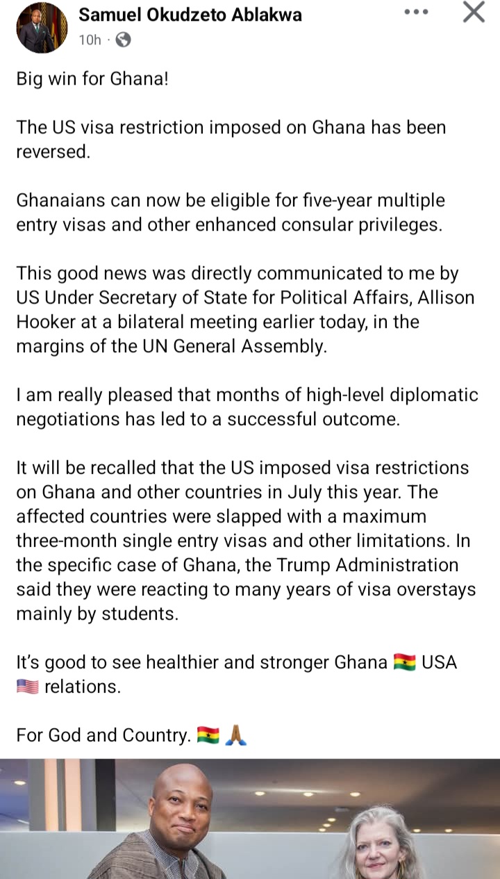 Foreign Minister Samuel Okudzeto Ablakwa announced the “big win for Ghana” today, confirming that Ghanaians are once again eligible for five-year multiple-entry visas and other enhanced consular privileges from the U.S.