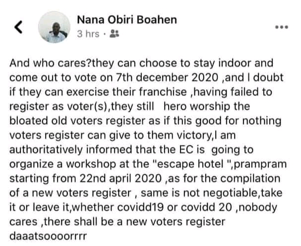 “I’m authoritatively informed that the EC is going to organize a workshop at “Escape Hotel”, Prampram starting from 22nd April 2020. As for compilation of a new voters register, same is not negotiable”, said Obiri Boahen.