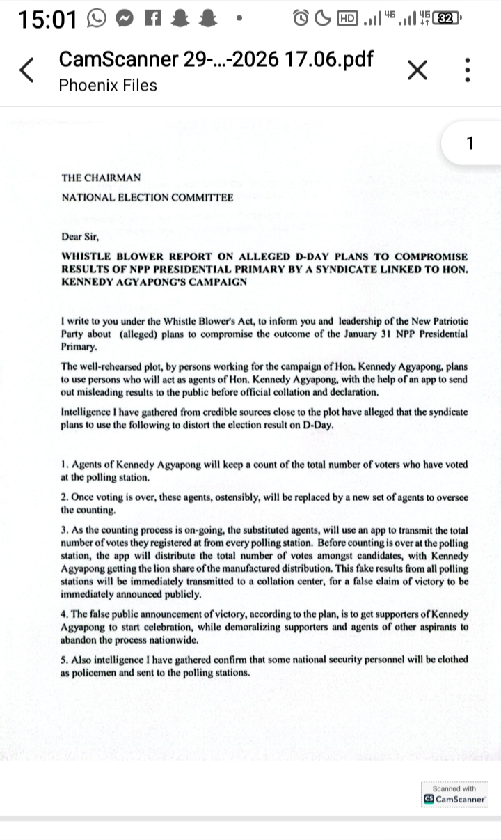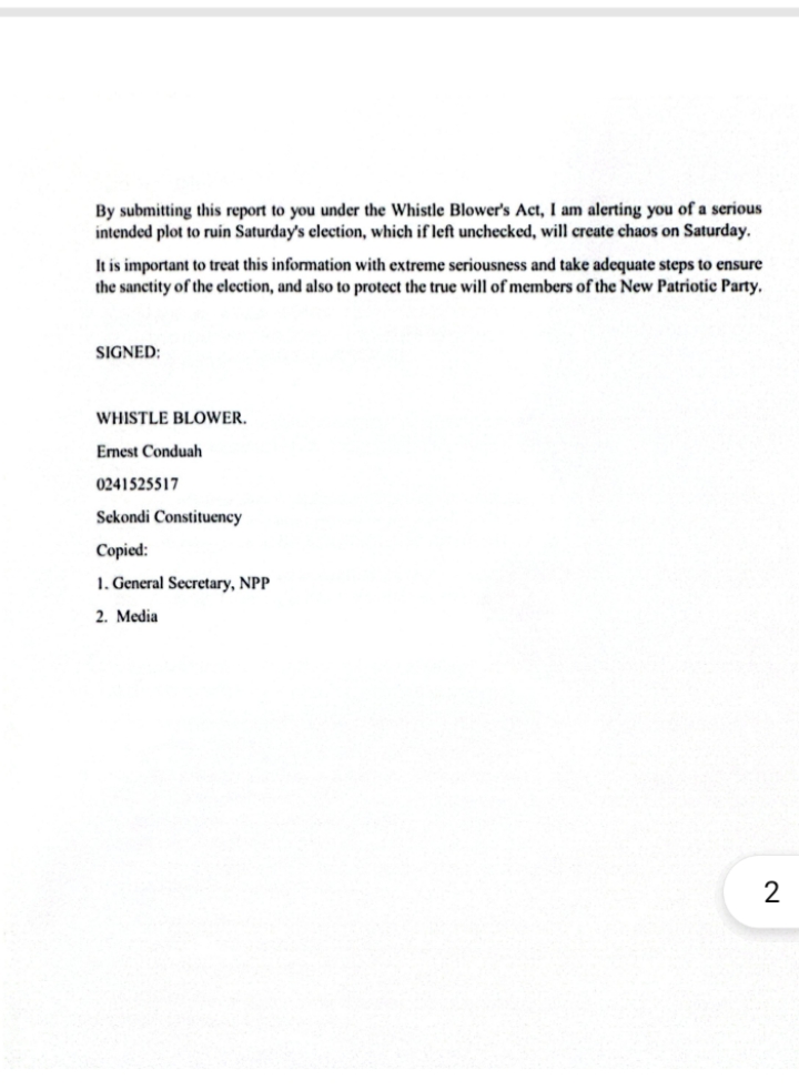 "I write to you under the Whistle Blower's Act, to inform you and leadership of the New Patriotic Party about plans to compromise the outcome of the January 31 NPP Presidential Primary," the informant wrote in his complaint to the party which was copied to the media.
